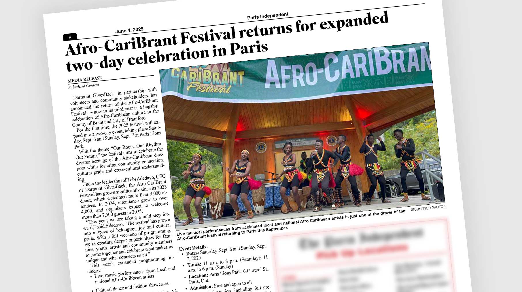 Darmont GivesBack, in collaboration with a passionate team of volunteers and community stakeholders, is proud to announce the return of the Afro-CariBrant Festival, now entering its 3rd year as the flagship Afro-Caribbean cultural event in the County of Brant and the City of Brantford. Expanding into a two-day celebration for the first time, the 2025 edition will take place on Saturday, September 6 and Sunday, September 7, 2025, at Paris Lions Park, Paris, Ontario.